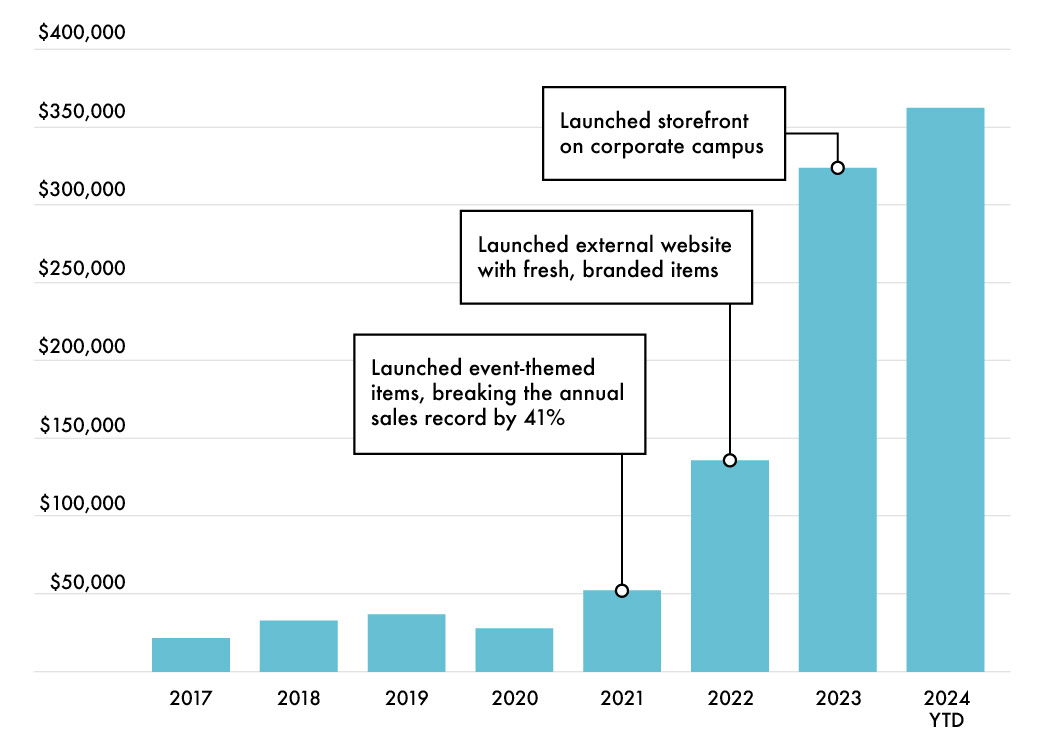 By bringing our company store in-house, my team delivered. The work included developing an overall retail strategy, building an external website and collaborating with our comms and social teams to advertise. After a year of consistent success, we were able to open a storefront on our corporate campus.